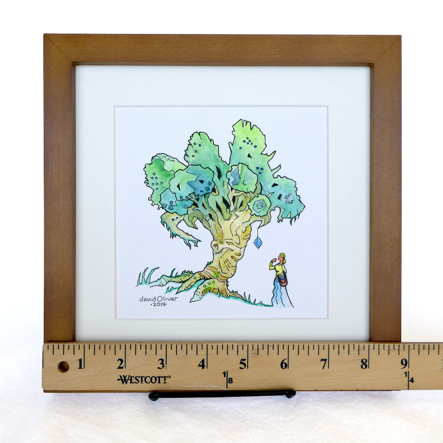 FINISH: Artwork mounted under acid-free mat in solid wood frame with light brown stain. Frame measures approximately 9 x 9 inches and includes 1.2 mm acrylic plexiglass, installed hanging hardware, and folding shelf stand.