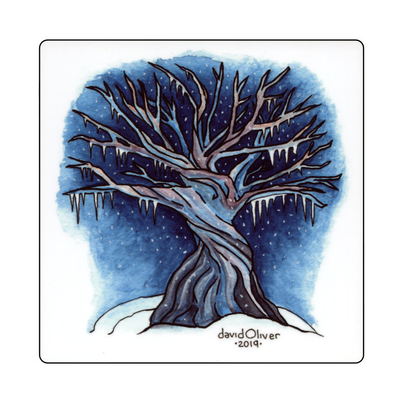 Freeze—Desktop plaque of my ink and watercolor illustration from my A Tree A Day collection. Printed on a wooden panel with high-gloss finish and built-in easel. This unique item is ready to display on a shelf or table top.